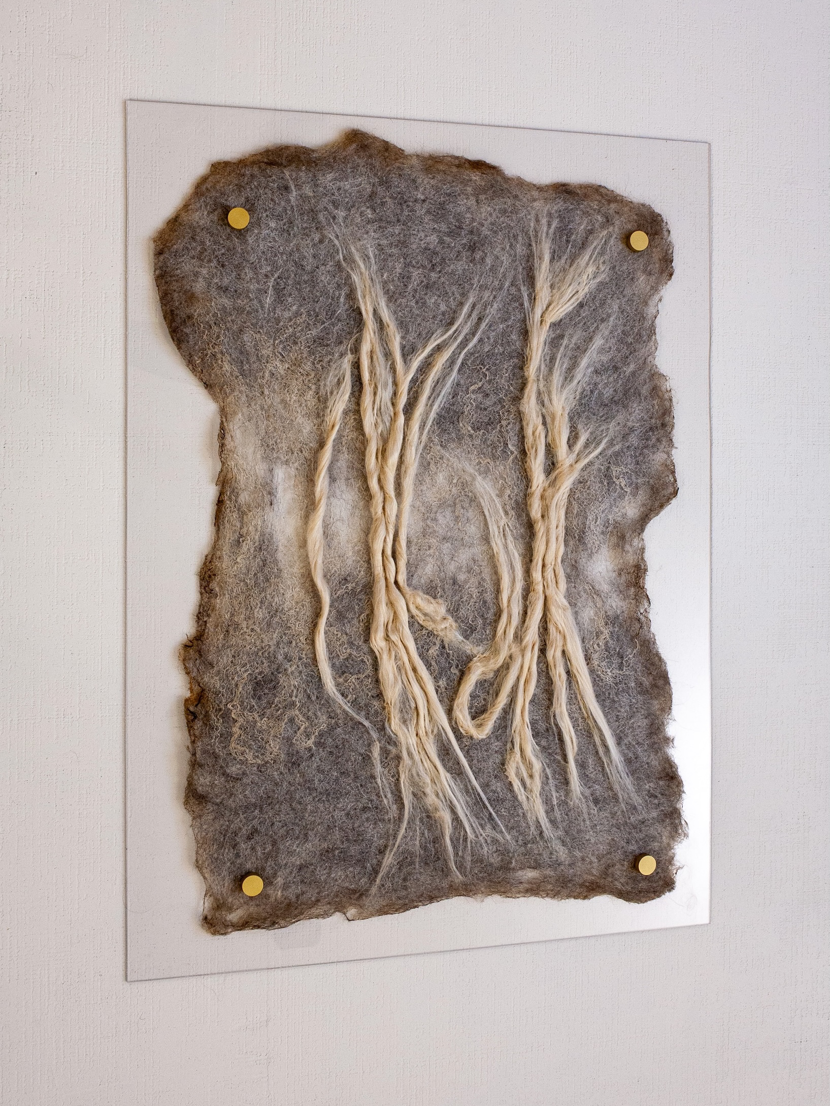 NFS. 2025, Missoula, MT. 31" H × 43" W × 0.5" D. Hand-felted and sculpted natural Gotland wool (ethically sourced, Montana) built as slow, layered “ribbons” to evoke geologic strata. Bottom edge is lightly burnt and toned with walnut ink to mark a horizon line. Subtle gray/white Ragdoll cat hair accents are integrated into the fibers. Mounted with standoffs.